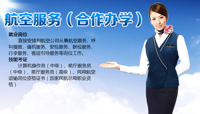 本专业与广州民航职业技术学院合作办学,结合目前南方航空公司的需求,定向培养紧缺的航空服务技能人才。学生前两年在学校完成航空服务基础理论学习和基本技能训练,并通过计算机操作员、前厅服务员考证;第三年派往广州民航职业技术学院航空运输业务培训中心接受培训,考取民用航空运输岗位资格证书,并由学院直接安排或推荐就业。本专业校校合作联办,集中优势培养,学校和培训中心理论教师业务熟练,实习指导教师技术过硬,教学设施先进齐全,实训设备精良配套,实训教学时间安排充足,实操过程现场指导到位,保证每个学生能够学懂,学会,学精,毕业后成为南方航空公司急需的优秀技能人才。